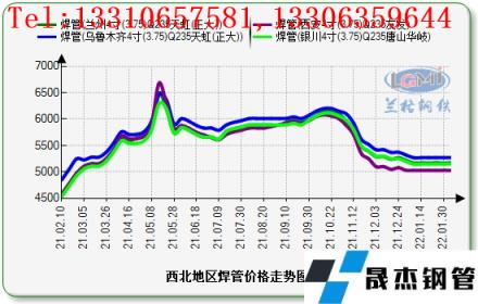 一月份(1.01-1.31),西北地區(qū)焊管鍍鋅管價格繼續(xù)下跌。云商平臺監(jiān)測數(shù)據(jù)顯示,截至2022年1月31日,西安地區(qū)4寸(3.75mm)焊管價格為5000-5030元,與上月同期價格持平;蘭州地區(qū)4寸(3.75mm)焊管價格為5150-5170元,比上月同期價格下跌50元;銀川地區(qū)4寸(3.75mm)焊管價格為5130-5150元,比上月同期下跌50元;烏魯木齊地區(qū)4寸(3.75mm)焊管價格為5190-5270元,比上月同期下跌50元。西安地區(qū)4寸(3.75mm)鍍鋅管價格為5900-6070元,比上月同期價格下跌140-240元;蘭州地區(qū)4寸(3.75mm)鍍鋅管價格為5880-6000元,比上月同期價格下跌50元;銀川地區(qū)4寸(3.75mm)焊管價格為5940-6000元,比上月同期下跌50元;烏魯木齊地區(qū)4寸(3.75mm)焊管價格為6260-6280元,比上月同期上漲40元。