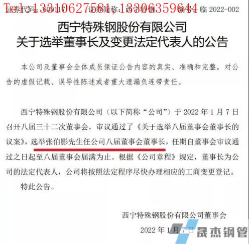 張伯影先生:1970年7月出生,漢族,中共黨員,中國國籍,河北人,大專學歷,工程師,歷任西寧特殊鋼股份有限公司煉鋼分廠一煉作業(yè)區(qū)作業(yè)長、煉鋼分廠廠長、煉軋分廠廠長、轉(zhuǎn)爐分廠廠長、三煉分廠廠長、鍛鋼分廠廠長、資源事業(yè)部部長、西寧特殊鋼股份有限公司副總經(jīng)理、總經(jīng)理及董事、青海西鋼新材料有限公司董事長,擬任西寧特殊鋼股份有限公司董事。