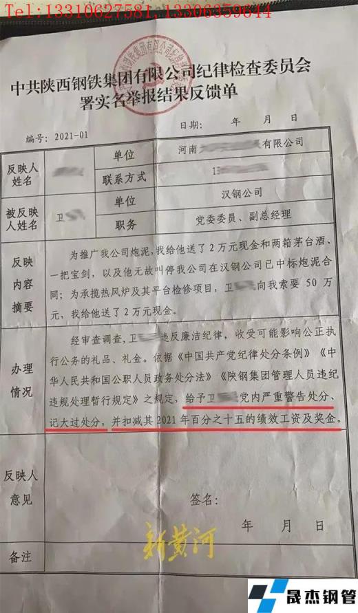 2021年4月,針對衛(wèi)某主動索賄、受賄一事,王木生向陜西省國資委、漢中市紀(jì)檢委等部門進(jìn)行了實(shí)名舉報(bào)。11月18日,新黃河記者了解到,陜鋼集團(tuán)紀(jì)委已對衛(wèi)某下達(dá)了處理結(jié)果:給予衛(wèi)某記大過及黨內(nèi)嚴(yán)重警告處分,并扣減2021年15%的績效工資及獎金。紀(jì)委工作人員表示,對衛(wèi)某已經(jīng)按照相關(guān)規(guī)定進(jìn)行了內(nèi)部處理,所收的相應(yīng)贓款也已經(jīng)沒收。