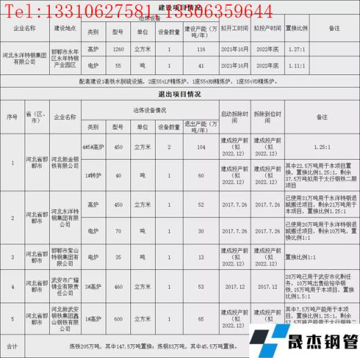 河北新金鋼鐵有限公司退出450m3高爐2座,產(chǎn)能104萬(wàn)噸/年;40t轉(zhuǎn)爐1座,產(chǎn)能60萬(wàn)噸/年。河北永洋特鋼集團(tuán)有限公司退出450m3高爐1座,產(chǎn)能52萬(wàn)噸/年;70t電爐1座,產(chǎn)能30萬(wàn)噸/年。邯鄲市紫山特鋼集團(tuán)有限公司退出35t電爐1座,產(chǎn)能13萬(wàn)噸/年。武安市廣耀鑄業(yè)有限責(zé)任公司退出460m3高爐1座,產(chǎn)能53萬(wàn)噸/年。河北新武安鋼鐵集團(tuán)鑫山鋼鐵有限公司退出600m3高爐1座,產(chǎn)能65萬(wàn)噸/年。