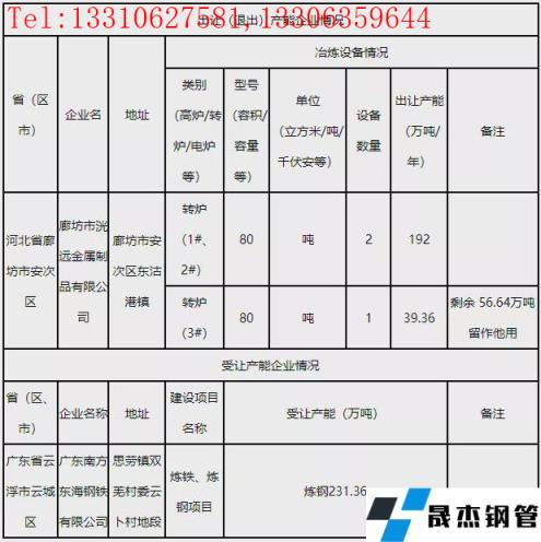 1月12日,河北工信廳發(fā)布變更廊坊市洸遠(yuǎn)金屬制品有限公司部分產(chǎn)能出讓方案。方案表明,廊坊市洸遠(yuǎn)金屬制品有限公司擬出讓80t轉(zhuǎn)爐3座給廣東南方東海鋼鐵有限公司,共計(jì)出讓煉鋼產(chǎn)能231.36萬(wàn)噸,剩余56.64萬(wàn)噸留作他用。