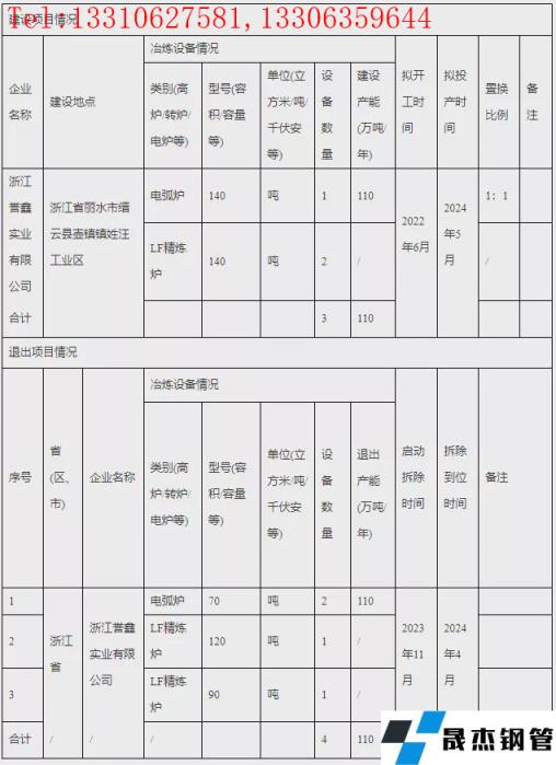 2022年1月7日,浙江省經(jīng)信廳發(fā)布浙江譽(yù)鑫實(shí)業(yè)技術(shù)改造升級(jí)建設(shè)項(xiàng)目產(chǎn)能置換方案。方案顯示,浙江譽(yù)鑫實(shí)業(yè)有限公司擬于2022年6月新建140t電弧爐1座和140tLF精煉爐2座,產(chǎn)能110萬(wàn)噸/年,項(xiàng)目預(yù)計(jì)2024年5月投產(chǎn)。同時(shí)退出70t電弧爐2座、120tLF精煉爐1座和90tLF精煉爐1座,共計(jì)退出產(chǎn)能110噸。項(xiàng)目于2023年11月啟動(dòng)拆除,并于2024年4月拆除到位。