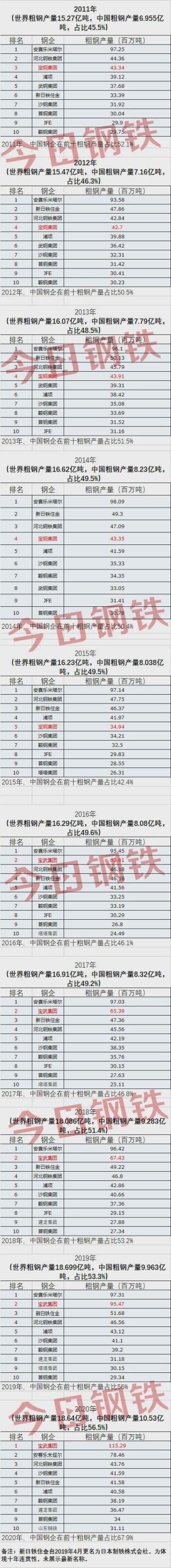 2021年8月,世界鋼鐵協(xié)會發(fā)布《世界鋼鐵統(tǒng)計數據2020》該統(tǒng)計數據根據2020年粗鋼產量情況對全球鋼鐵企業(yè)進行排名,并發(fā)布了全球前50大鋼鐵企業(yè)名單。中國寶武以2020年11529萬噸粗鋼產量位列榜首!這也是中國鋼企首次登頂世界之巔,也是世界鋼鐵企業(yè)首次沖破一億噸粗鋼產量大關!