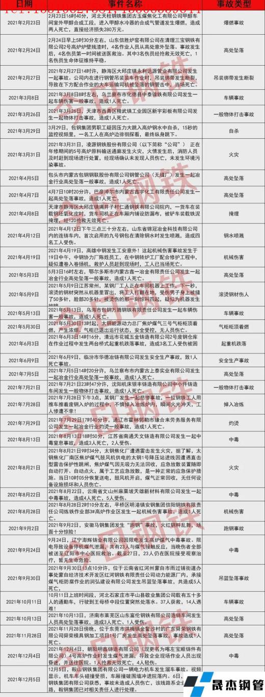 當(dāng)前安全生產(chǎn)工作正處于關(guān)鍵時(shí)期,鋼鐵企業(yè)要嚴(yán)防安全風(fēng)險(xiǎn)因素的產(chǎn)生?;仡?021年小編將一些具有代表性的安全事故案例匯編如下:
