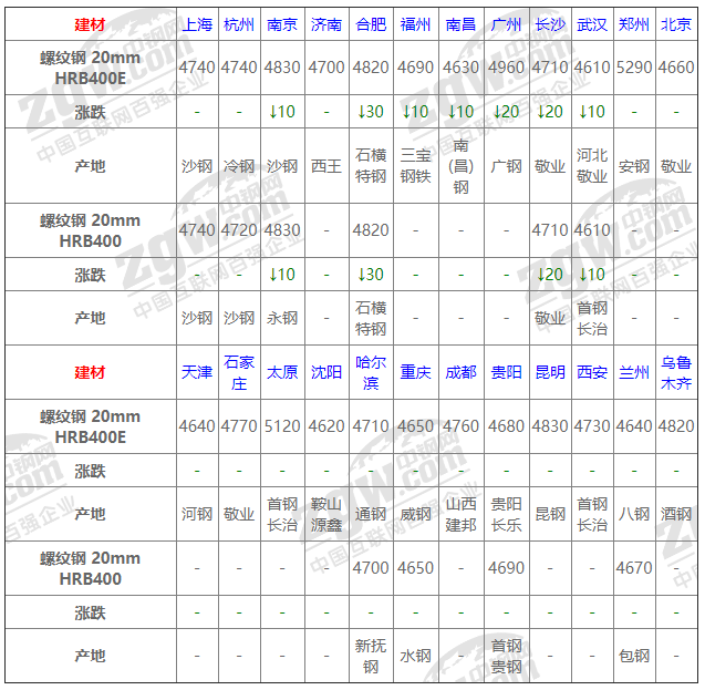 全國24個主要市場螺紋鋼 20mm HRB400E平均價格4765元/噸,較上個交易日下調(diào)5元/噸。