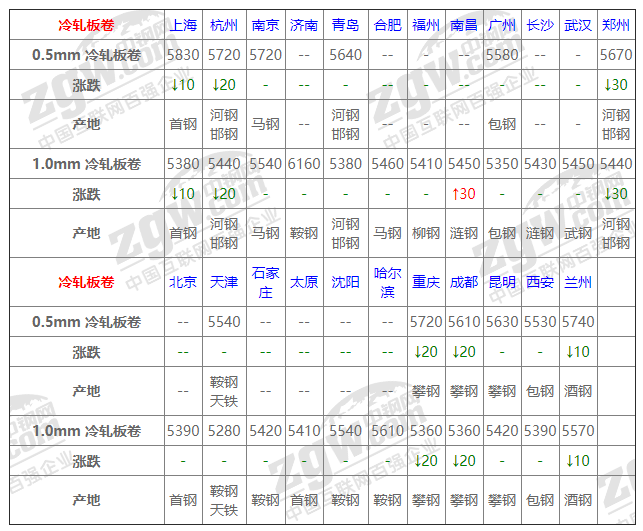 全國23個主要市場1.0mm 冷軋板卷平均價格5463元/噸,較上個交易日下調(diào)5元/噸。