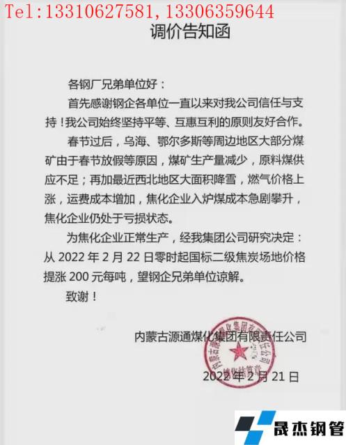 考慮運(yùn)費(fèi)等價(jià)格上漲,自2月22日零時(shí)起對二級焦炭價(jià)格上調(diào)200元/噸,具體內(nèi)容如下: