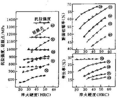 40Cr鋼經(jīng)過830℃加熱在不同淬火冷卻速度下獲得不同層淬火硬度后,通過不同的淬火溫度,回火得到不同的回火硬度,然后進(jìn)行拉伸試驗(yàn)。結(jié)果表明,抗拉強(qiáng)度取決于最后回火硬度,幾乎不受淬火硬度的影響;而屈服度強(qiáng)度、伸長率和斷面收縮率不僅取決于回火硬度,也與淬火硬度有很大關(guān)系,在回火得到相同硬度的條件下,這些性能指標(biāo)隨淬火硬度的升高而提高。因此,淬火回火工件不能只控制其回火后的硬度,還應(yīng)檢驗(yàn)淬火后的硬度,以便檢查工件淬火是否充分,不充分的淬火,在大多數(shù)時(shí)候應(yīng)作為熱處理缺陷重新返工處理。