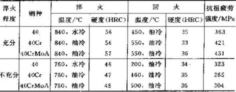 用40鋼、40Cr鋼和40CrMoA鋼加工成兩組疲勞試樣,第一組式樣在840℃正常淬火溫度下加熱淬火,硬度為56~57HRC,第二組用760℃淬火,淬火不充分,淬火硬度只能達(dá)到46~48HRC,將兩組式樣經(jīng)過不同溫度回火至相同硬度(均為33~36HRC)然后進(jìn)行疲勞試驗(yàn),試驗(yàn)結(jié)果列于表1.實(shí)驗(yàn)表明,淬火不充分的第二組試樣的抗扭疲勞強(qiáng)度比充分淬火的第一組試樣的抗扭疲勞強(qiáng)度低10.8%~37%。