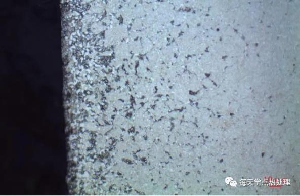 將碳氮共滲中工件的橫截面拋光后,在未腐蝕或輕微腐蝕的狀態(tài)下,使用光學(xué)顯微鏡在表面滲層中有時(shí)可觀察到一些分散的大小不一的黑色或暗灰色的斑點(diǎn)、黑帶和黑網(wǎng),這些深色的斑點(diǎn)、黑帶和黑網(wǎng),統(tǒng)稱為黑色組織。黑色組織的深度一般不超過0.05mm。深色的斑點(diǎn)是一些主要沿奧氏體晶界分布的大小不一的孔洞。黑色帶通常出現(xiàn)在距表面0.03mm深度內(nèi),黑帶的內(nèi)測往往可觀察到黑色網(wǎng),主要由于表層形成了某些合金元素的碳氧化物、氮氧化物和碳化物等小顆粒,使奧氏體中合金元素貧化,導(dǎo)致淬透性降低而形成了托氏體的結(jié)果。碳氮共滲的黑色組織類似于氣體滲碳的內(nèi)氧化,使表面硬度下降,有益的殘余壓應(yīng)力減小,或表面形成殘余拉應(yīng)力,導(dǎo)致疲勞強(qiáng)度的降低。20Cr2Ni4A鋼碳氮共滲試樣表面黑色組織可使彎曲疲勞強(qiáng)度降低約6%。