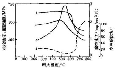 ▲圖5回火溫度對2Cr13性不銹鋼性能的影響1-抗拉強(qiáng)度2-屈服強(qiáng)度 3-20℃NaCl 3%水溶液中的腐蝕率4-艾氏沖擊韌度