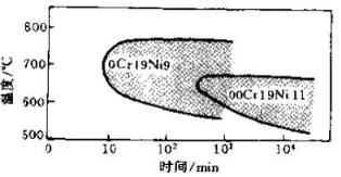 然而在某個(gè)特定溫度區(qū)間和時(shí)間參數(shù)下進(jìn)行熱處理或在某個(gè)溫度區(qū)間長期使用時(shí),由于含鉻碳化物沿晶界析出將導(dǎo)致晶界腐蝕抗力的急劇下降。表示發(fā)生晶界腐蝕的熱處理溫度和時(shí)間關(guān)系曲線叫做時(shí)間-溫度-敏化曲線(T-T-S曲線)。圖6 就是奧氏體不銹鋼的典型T-T-S曲線。在C型曲線的右側(cè)熱處理狀態(tài)下,不銹鋼易產(chǎn)生晶間腐蝕。