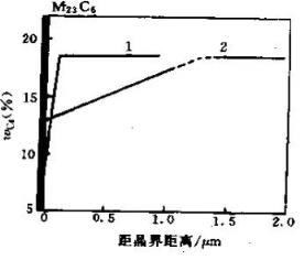 2.2.6脫碳的影響 滲碳工件在緩冷期和重新加熱淬火期間,由于溫度連續(xù)變化,氣氛碳勢和滲碳工件表面碳的質(zhì)量分?jǐn)?shù)不可能達(dá)到平衡。當(dāng)氣氛碳勢低于滲碳表面的碳的質(zhì)量分?jǐn)?shù)時(shí),滲碳工件表面發(fā)生脫碳。脫碳層的顯微組織取決于表層的碳的質(zhì)量分?jǐn)?shù)及淬火冷卻速度,當(dāng)表層僅有輕微脫碳時(shí),有可能降低表層殘余奧氏體含量,表層硬度下降很少甚至略有提高;嚴(yán)重的脫碳將使表層出現(xiàn)非馬氏體組織,降低表層硬度,使表層呈現(xiàn)殘余拉應(yīng)力狀態(tài),使疲勞強(qiáng)度下降。試驗(yàn)表明,0.22mm的脫碳層使Cr-3%Ni鋼的彎曲疲勞強(qiáng)度降低40%。當(dāng)CrMnTi鋼的滲碳層由于脫碳使其硬度下降到41~42HRC時(shí),疲勞極限下降50%。三、耐腐蝕性能不良 在腐蝕性環(huán)境中工作的零件大多用不銹鋼制造。不銹鋼是含鉻超過5%的鐵基合金的總稱。但要從真正耐腐蝕的角度看,鋼中鉻的含量(w)必須超過10%。不銹鋼的耐腐蝕性來自于其中的鉻,這歸因于不銹鋼的表面能形成一層稱為鈍化膜的耐腐蝕的富鉻薄膜,由水化鉻酸CrxOx(OH)8x-2·nH2O組成。鉻的質(zhì)量分?jǐn)?shù)越高。鈍化膜中相對鉻含量越多。耐腐蝕性越好。不銹鋼按其金相組織分為馬氏體不銹鋼、鐵素體不銹鋼、奧氏體不銹鋼、鐵素體-奧氏體不銹鋼和沉淀硬化不銹鋼五類,鉻在不銹鋼中分布不均勻?qū)?dǎo)致其耐腐蝕性下降,熱處理影響鉻在不銹鋼中的分布,因而熱處理也極大的影響不銹鋼的耐蝕性。2Cr13型馬氏體不銹鋼若回火溫度選擇不當(dāng),在450℃~600℃回火時(shí),由于Cr23C6型碳化物沿晶界析出,導(dǎo)致晶界附近局部鉻貧化,腐蝕抗力大幅度下降,如圖5 所示。