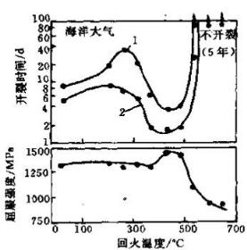 強(qiáng)度強(qiáng)烈地影響馬氏體不銹鋼的應(yīng)力腐蝕開裂行為。淬火狀態(tài)下其應(yīng)力腐蝕開裂的傾向很大,隨著回火溫度的升高,應(yīng)力腐蝕抗力顯著得到改善,但是對于Cr12型馬氏體不銹鋼,在400-550℃溫度區(qū)間回火時(shí),由于M23C6型碳化物的析出造成基體局部貧鉻,會(huì)出現(xiàn)應(yīng)力腐蝕抗力低谷。見圖10 。