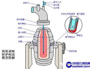 原料:1.鐵水(80%-85%):用封閉保溫的魚雷罐車從煉鐵廠運(yùn)來(以前用敞口鐵水罐);2.廢鋼(15%-20%):事先破碎不攙雜質(zhì)異物。