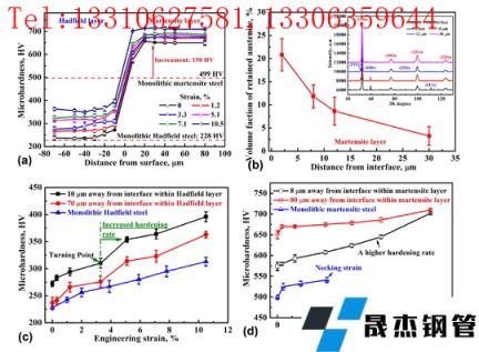 總之,盡管哈德菲爾德層為馬氏體貢獻了 20% 的碳,但仍保留了它的高應變硬化能力。這一點對于本研究中元素擴散策略的成功具有戰(zhàn)略意義。首先,哈德菲爾德層的初始硬化率與整體鋼相當。根據(jù)元素分布結(jié)果(圖 2(a)),兩層之間存在過渡層(約20μm厚),其厚度根據(jù)硬度分布增加到約45μm(圖 4)。該結(jié)果表明復合鋼由哈德菲爾德層、馬氏體層和梯度層組成。幾項關(guān)于梯度結(jié)構(gòu)的有趣研究表明,在細晶粒和粗晶粒之間的界面處產(chǎn)生的應力不相容性可能導致應變梯度,這將通過梯度區(qū)域中的幾何必要位錯 (GND) 來適應 。