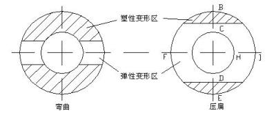 橫向壓扁及通過疊加橢圓壓扁變形來達到矯直的目的。在矯直截面中產生如圖8-9中BCDE的塑性區(qū)。這對矯直效果是非常重要的,因為彎曲矯直不能使截面全部為塑性區(qū),利用壓扁變形來補償。另外,對局部彎曲、管端彎曲、縱向彎曲矯直效果很差,必須是縱向彎曲和壓扁的共同作用才能達到滿意的矯直效果。(注:提高厚壁鋼管壁厚精度可提高厚壁鋼管的抗壓
