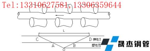 縱向彎曲矯直是使厚壁鋼管產生與彎曲相反方向的塑性變形來達到矯直彎曲的目的,而不彎曲的管子斷面只產生彈性變形,塑性變形區(qū)占支撐距的40%長度。