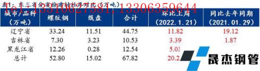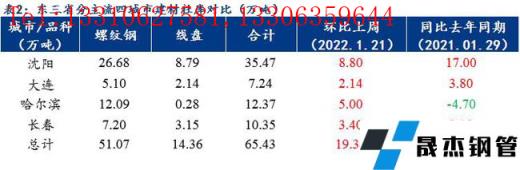 本周東三省建筑鋼材現(xiàn)貨庫(kù)存增加較多,增幅明顯超上周,其中螺紋鋼現(xiàn)貨庫(kù)存52.8萬(wàn)噸,線盤(pán)15.02萬(wàn)噸,建材社會(huì)庫(kù)存總量為67.82萬(wàn)噸,較上周增20.24萬(wàn)噸,增幅高達(dá)42.54%。隨著春節(jié)的臨近,北方下游終端工程進(jìn)入全停工狀態(tài),需求已無(wú),出貨趨零,加之各個(gè)無(wú)縫鋼管廠家廠庫(kù)前移至市場(chǎng)各倉(cāng)庫(kù)的現(xiàn)貨相對(duì)較多,社庫(kù)開(kāi)始大幅度累庫(kù)。
