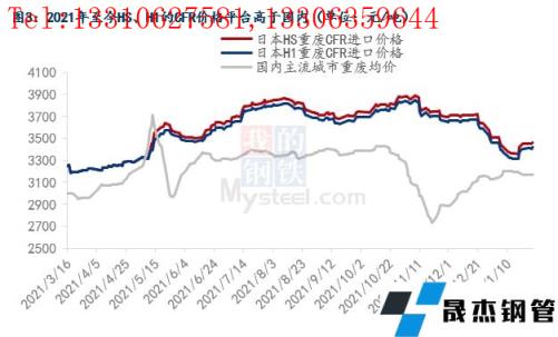放開(kāi)廢鋼進(jìn)口后的首年,進(jìn)口量卻不及預(yù)期,2021年進(jìn)口總量?jī)H為55.5萬(wàn)噸,遠(yuǎn)低于2019年之前平均每年200萬(wàn)噸以上的水平。原因主要有兩方面:一是政策導(dǎo)向,2021年能夠入境的再生鋼鐵料所對(duì)應(yīng)的海關(guān)商品編碼只有5類,其對(duì)應(yīng)的海關(guān)編碼分別是:7204100010(鑄鐵碎料)、7204210010(不銹碎料)、7204290010(其他合金碎料)、7204410010(粉狀廢料)、7204490030(其他廢碎料),上述類別均屬于純凈的優(yōu)質(zhì)廢鋼,政策決定了廢鋼的進(jìn)口門檻變高;二是以日本優(yōu)質(zhì)重廢HS、H1為例,兩種料形的CFR價(jià)格平臺(tái)在2021年中均高于國(guó)內(nèi)主流城市的重廢均價(jià)(圖3),由于這兩種料形均屬于日本國(guó)內(nèi)的優(yōu)質(zhì)廢鋼,其資源量本身就有限,出口量不大,外加?xùn)|亞地區(qū)的其他國(guó)家也會(huì)從日本進(jìn)口該料形,所以這種優(yōu)質(zhì)廢鋼在2021年中基本處于供小于求的狀態(tài),價(jià)格因此高企。但以日本中廢H2為例,由于該料形要差于HS、H1,所以H2料形的CFR價(jià)格平臺(tái)接近國(guó)內(nèi)主流城市的中廢均價(jià)(圖4)。