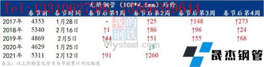 小編匯總近5年春節(jié)后四周無縫厚壁鋼管均價變化情況,以供參考。從近5年時間來看,無縫管以上漲為主,只有2020年由于公共衛(wèi)生事件影響,需求遲遲無法啟動,導致價格回落,其他幾年都出現(xiàn)了“開門紅”。
