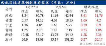 截至到2月6日,據(jù)不完全統(tǒng)計,西北區(qū)域社會總庫存約在141.42萬噸,與節(jié)前(1月27日)相比,周環(huán)比增加26.44萬噸。分區(qū)域來看,陜西、新疆和甘肅區(qū)域社庫分別增加15.17萬噸、3.53萬噸和5.26萬噸,而寧夏和青海區(qū)域社庫則增幅較少,分別增加1.19萬噸和1.29萬噸。