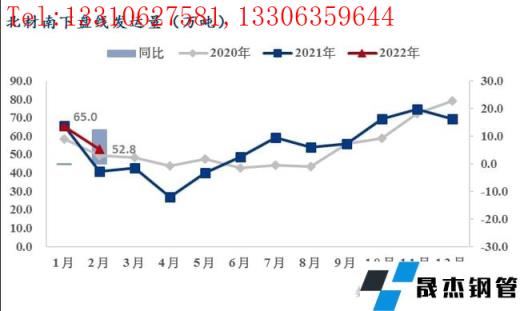 2022年2月東北螺紋南下計(jì)劃量為75.3萬(wàn)噸,同比增加11.1萬(wàn)噸環(huán)比增加0.5萬(wàn)噸,盤線南下計(jì)劃量52.8萬(wàn)噸,同比增加12.1萬(wàn)噸環(huán)比減少12.2萬(wàn)噸;1月東北螺紋南下實(shí)發(fā)量為74.8萬(wàn)噸,同比減少8.7萬(wàn)噸環(huán)比減少30.8萬(wàn)噸,盤線南下實(shí)發(fā)量65.0萬(wàn)噸,同比減少0.5萬(wàn)噸環(huán)比減少13.6萬(wàn)噸。受無(wú)縫厚壁鋼管廠家1月實(shí)際產(chǎn)量較計(jì)劃減量以及無(wú)縫厚壁鋼管廠家增加省內(nèi)投放等因素影響,1月螺紋和盤線的南下實(shí)發(fā)量較月初計(jì)劃分別減少19.1萬(wàn)噸和27.9萬(wàn)噸。