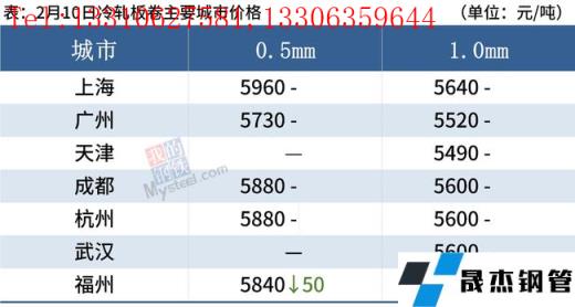 冷軋板卷:2月10日,全國24個主要城市1.0mm冷卷均價5593元/噸,較上個交易日下跌1元/噸。今日黑色系期貨盤面整體呈低開高走的態(tài)勢,在期貨盤面的影響下,午后市場詢單人數(shù)明顯增加,但由于下游客戶觀望情緒較為濃厚,今日整體成交一般。庫存方面,據(jù)不完全統(tǒng)計,現(xiàn)冷軋無縫厚壁鋼管廠家?guī)齑?3.71萬噸,周環(huán)比增加0.5萬噸,社會庫存139.17萬噸,周環(huán)比增加5.47萬噸,周消費(fèi)量67.89萬噸,環(huán)比減少1.26萬噸。綜合來看,故預(yù)計11日國內(nèi)冷軋板卷價格或?qū)⒄鹗庍\(yùn)行。
