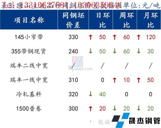 145帶鋼與鋼坯價差拉大,小窄帶漲幅高于鋼坯上漲速度,調坯軋材廠仍在停產(chǎn)。焊管與355帶鋼價差較昨日持平,熱卷與帶鋼價差擴大,卷帶差修復。