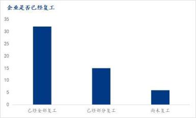 2、截止調(diào)研日,已經(jīng)有超過(guò)88.68%的企業(yè)完全復(fù)工或部分復(fù)工,未復(fù)工的企業(yè)也將在未來(lái)1-2周之內(nèi)復(fù)工;復(fù)工企業(yè)當(dāng)中基本都已正常生產(chǎn),只有5.7%企業(yè)延遲1-2周恢復(fù)到正常生產(chǎn)狀態(tài);