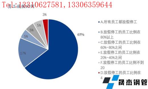 本次調(diào)研樣本企業(yè)中所有員工均放假的占比65%;放假停工的員工比例80%以上的占比17%;放假停工的員工比例60-80%的占比5%;放假停工的員工比例60%以下的僅有13%。