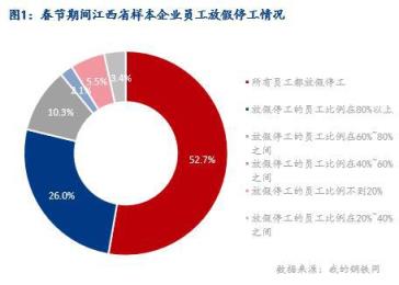 1、今年春節(jié)期間江西省樣本企業(yè)所有員工都放假停工的企業(yè)占調(diào)研樣本比例為52.7%,放假停工的員工比例不到20%的企業(yè)僅占比5.5%
