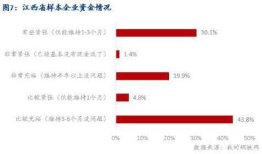 4、調(diào)研企業(yè)資金情況發(fā)現(xiàn):從企業(yè)當(dāng)前現(xiàn)金流情況來看,據(jù)調(diào)研,63.7%的樣本企業(yè)資金流是比較或者非常充裕的,30.1%的樣本企業(yè)資金有些緊張,僅能維持1-3個月,而資金壓力比較及非常緊張的樣本企業(yè)占比6.2%。