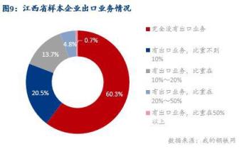 據(jù)調(diào)研,61%的樣本企業(yè)沒有出口業(yè)務(wù),39 %的樣本企業(yè)有出口業(yè)務(wù),出口業(yè)務(wù)比重大多集中在10%以內(nèi)。