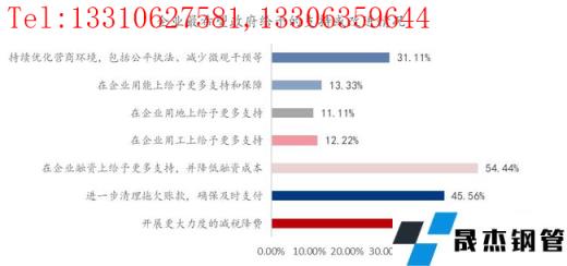 8、對(duì)于2022年發(fā)展前景預(yù)期偏謹(jǐn)慎。本次調(diào)研樣本企業(yè)中對(duì)2022年發(fā)展前景預(yù)期持樂(lè)觀或比較以及非常樂(lè)觀的企業(yè)占比57.58%,不太樂(lè)觀或比較悲觀的企業(yè)占比為33.33%,因此對(duì)于未來(lái)一段時(shí)間的投入情況,持適當(dāng)或大規(guī)模增加的企業(yè)占比為46.46%,暫不增加投入的占比為43.43%,適當(dāng)縮減或退出部分業(yè)務(wù)的企業(yè)占比為10.10%,由此看來(lái),目前整體經(jīng)濟(jì)環(huán)境的確面臨一定壓力,導(dǎo)致企業(yè)信心相對(duì)保守,而主要原因是經(jīng)濟(jì)下行壓力下,穩(wěn)增長(zhǎng)政策力度不夠。企業(yè)希望得到政府的支持與改進(jìn)的呼聲最大的是開(kāi)展更大力度的減稅降費(fèi)以及降低融資成本,進(jìn)一步清理拖欠賬款,確保及時(shí)支付,持續(xù)優(yōu)化營(yíng)商環(huán)境,公平執(zhí)法、減少微觀干預(yù)。
