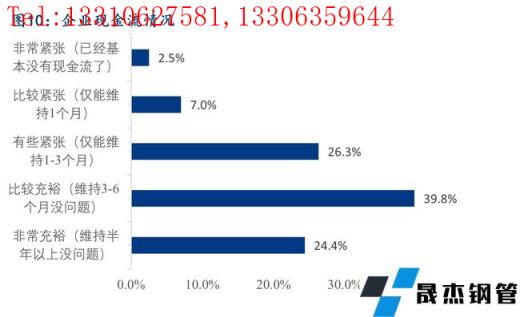 據(jù)調研,64.1%的樣本企業(yè)資金流是比較或者非常充裕的,26.3%的樣本企業(yè)資金有些緊張,僅能維持1-3個月,而資金壓力比較及非常緊張的樣本企業(yè)占比9.6%。