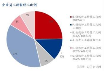 調研企業(yè)樣本中,放假停工的員工比例在20%~40%之間占比7.76%,放假停工的員工比例在40%~60%之間占比 8.65%;放假停工的員工比例在60%~80%之間占比8.65%;放假停工的員工比例不到20%占比12.86%;放假停工的員工比例在80%以上占比24.83%;所有員工都放假停工占比37.25%。