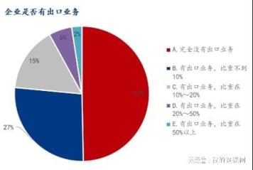 參與調研企業(yè)中,49.67%企業(yè)表示完全沒有出口業(yè)務,50.33%企業(yè)有出口業(yè)務,具體看有出口業(yè)務,比重不到10%占比26.83%;有出口業(yè)務,比重在10%~20%占比15.52%;有出口業(yè)務,比重在20%~50%占比5.54%;有出口業(yè)務,比重在50%以上占比2.44%。