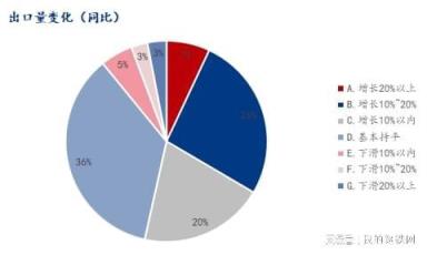 與去年同期相比,關于今年的出口量變化,在有出口業(yè)務的樣本中53.48%企業(yè)表示出口有增長,35.65%企業(yè)表示基本持平,10.87%企業(yè)出口下滑。具體來看增長20%以上占比6.96%,增長10%~20%占比26.52%,增長10%以內占比20.00%,基本持平占比35.65%,下滑10%以內占比5.22%,下滑10%~20%占比2.61%,下滑20%以上占比3.04%。