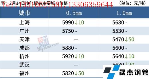 冷軋板卷:2月14日,全國24個(gè)主要城市1.0mm冷卷均價(jià)5611元/噸,較上個(gè)交易日下跌9元/噸。今日開盤黑色系期貨價(jià)格寬幅走跌,熱軋現(xiàn)貨價(jià)格大幅回落,冷軋市場部分城市跟跌。據(jù)反饋,商戶全面復(fù)工復(fù)產(chǎn),下游終端用戶采購積極性偏差,冷軋成交偏弱。心態(tài)面看,市場商戶對本周行情整體偏謹(jǐn)慎,局部市場庫存壓力較大,商戶多出貨為主。預(yù)計(jì)15日全國冷軋板卷現(xiàn)貨價(jià)格多震蕩下調(diào)為主。