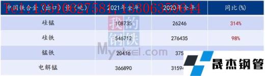 據(jù)統(tǒng)計(jì),2021年國內(nèi)硅錳、硅鐵、錳鐵、電解錳合金出口量均有不同程度的抬升,得益于2021年全球粗鋼產(chǎn)量的增加,(19.505億噸,同比提高3.7%)。