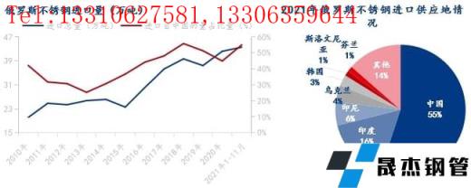 在需求增長(zhǎng)帶動(dòng)下,近年來(lái)俄羅斯不銹鋼進(jìn)口量大幅提升,2021年1-11月進(jìn)口量累計(jì)約43.57萬(wàn)噸,其中中國(guó)進(jìn)口占比約55%。