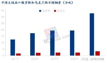 從中國(guó)海關(guān)數(shù)據(jù)了解到,中國(guó)大陸出口俄羅斯和烏克蘭的不銹鋼量呈上漲趨勢(shì),2021年出口至俄羅斯的量約32.77萬(wàn)噸(約為中國(guó)大陸出口總量的7.3%),同比增加68.3%;出口烏克蘭的量約3.46萬(wàn)噸(約為中國(guó)大陸出口總量的0.8%),同比增加44.9%。