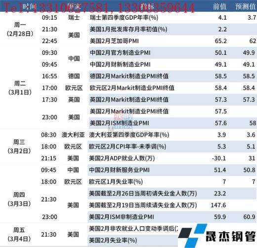 點(diǎn)評(píng):2月是制造業(yè)生產(chǎn)淡季,季節(jié)性因素導(dǎo)致PMI可能下降,預(yù)計(jì)制造業(yè)PMI可能在49.8%左右,穩(wěn)增長(zhǎng)力度加大有望推動(dòng)未來(lái)PMI指數(shù)上升。主要無(wú)縫厚壁鋼管廠(chǎng)家建筑厚壁無(wú)縫鋼管庫(kù)存上升,可能是基建投資預(yù)期改善帶來(lái)庫(kù)存需求。主要受疫情散發(fā)的影響,預(yù)計(jì)2月非制造業(yè)PMI下降到50.6%左右。