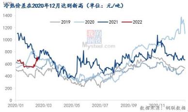 去年同期(2021年2月),由于汽車以及直接出口需求旺盛,冷軋強熱軋弱的局面明顯,冷軋總庫存累庫高度同比降幅達20%,冷熱價差也拉到新高,月均值達800元/噸以上。在去年同期冷軋“如火如荼”的行情襯托下,顯得今年的冷軋春天愈發(fā)“寒冷”。