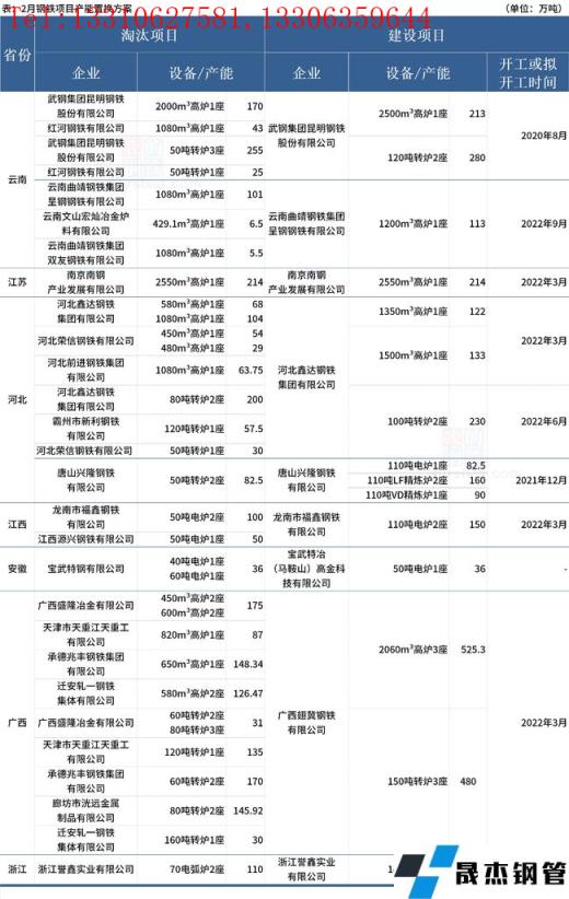 據(jù)不完全統(tǒng)計,2022年2月有9家無縫厚壁鋼管廠家發(fā)布鋼鐵產(chǎn)能置換方案。其中,涉及新建煉鋼產(chǎn)能1328萬噸,新建煉鐵產(chǎn)能1320.3萬噸;涉及淘汰煉鋼產(chǎn)能超1567.92萬噸,淘汰煉鐵產(chǎn)能1395.56萬噸。