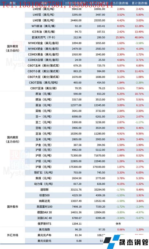 近期,受國際局勢影響,全球金融及大宗商品市場出現(xiàn)較大波動。3月1日,國際能源、農(nóng)產(chǎn)品、金屬價格仍大幅上漲,原油累漲超10%、歐洲天然氣累漲超40%。匯總情況如下: