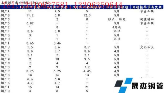 從1月和2月實際裝船量來看,大部分無縫厚壁鋼管廠家都出現(xiàn)了增長,尤其是國營鋼企。在“鋼鐵生產以滿足國內需求為主”政策主導下,2021年下半年多家國營無縫厚壁鋼管廠家主動減少鋼鐵產品出口,并且將部分訂單裝船推遲至今年1、2月份。這是導致今年1、2月份實際出口量增加的一個重要因素。目前各無縫厚壁鋼管廠家的接單情況都比較良好,熱軋板卷無縫厚壁鋼管廠家最甚。據悉各大無縫厚壁鋼管廠家可接訂單船期集中在4-5月,也有部分無縫厚壁鋼管廠家受限產影響 ,4月之后的可出貨量暫無法確定。具體情況如下: