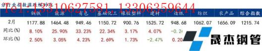 同比來看,2月份鋼鐵、能源、有色、基礎(chǔ)化工、橡膠塑料、建材、紡織、農(nóng)產(chǎn)品等8個行業(yè)價格指數(shù)上漲。