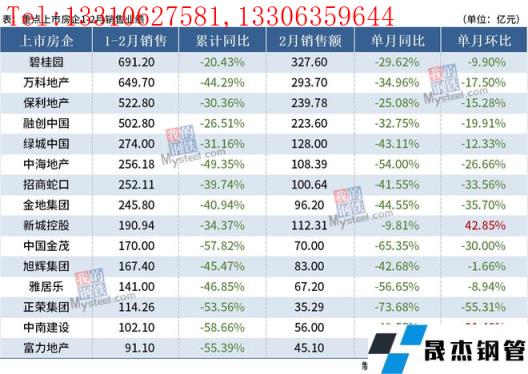 免責聲明:本網(wǎng)站(山東聊城晟杰無縫鋼管廠m.abagaf.com)刊載的“15家重點房企2月銷售同比降幅擴大,房地產(chǎn)下行壓力持續(xù)”等均源于網(wǎng)絡(luò),版權(quán)歸原作者所有,且僅代表原作者觀點,本文所載信息僅供參考。轉(zhuǎn)載僅為學習與交流之目的,如無意中侵犯您的合法權(quán)益,請及時聯(lián)系刪除。本網(wǎng)站刊登此篇文章并不意味著本站贊同其觀點或證實其內(nèi)容的真實性,我們不對其科學性、嚴肅性等作任何形式的保證。如果侵犯了您的版權(quán),請盡快聯(lián)系我們予以撤銷,謝謝合作!